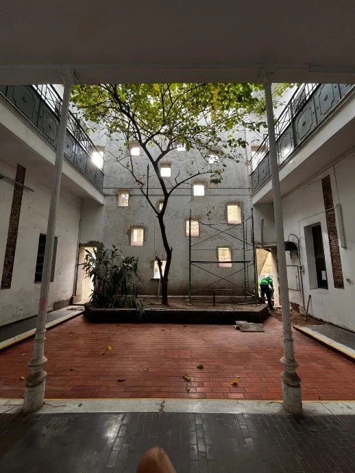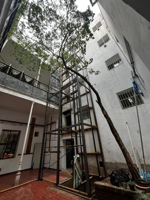 Sobre la actual biblioteca hay un doble techo de chapa que debe haber sido hecho por filtraciones, se van a desarmar esos techos y solucionar las filtraciones y la estructuras se reutilizaran todo lo posible para el techo de vidrio sobre patio del ascensor. Las chapas se utilizaran para el taller que se construye al fondo de la planta.