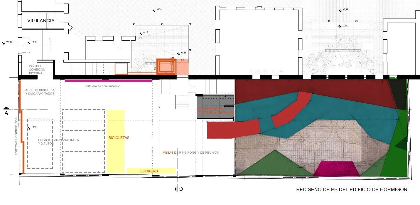 El patio de PB esta absolutamente desaprovechado y descuidado, la propuesta es convertirlo en un espacio vital del edifio, el vinculo entre los 2 edificio que los termine de unir. Un juego de terrazas y rampas soluciona el desnivel que hay entre ambos (1,20m) y lo convierte en un espacio mas rico que un piso plano, se expresa esta diferencia de altura como un topografía que va armando lugares para sentarse, reunirse o dar charlas al aire libre aprovechando la forma de Cine que tiene la medianera Norte. Los rellenos para el aterrazamiento se realizan con los mismos escombros que se producen por la perforación del muro y del piso del patio actual, disminuyendo costos.
