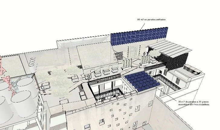 La terraza de la casona antigua es especialmente apta para desarrollar energía solar y especies vegetales, tiene un asoleamiento perfecto y casi sin sobra proyectada por edicios vecinos y tiene una medianera de gran tamaño que recibe este sol. Se propone un sistema de colectores fotvoltaicos sin baterías, conectado a la red con la posibilidad de vender el excedente (sobre todo en verano). Se necesita para cubrir el consumo actual una superficie de 100m2 de paneles, esto se puede hacer por etapas ya que la pared medianera es enorme y los paneles puestos en forma vertical con esta orientación funcionan muy bien. Ya tuvimos una reunión con la empresa RAYO de la que tengo muy buenas referencias (adjunto brochure)