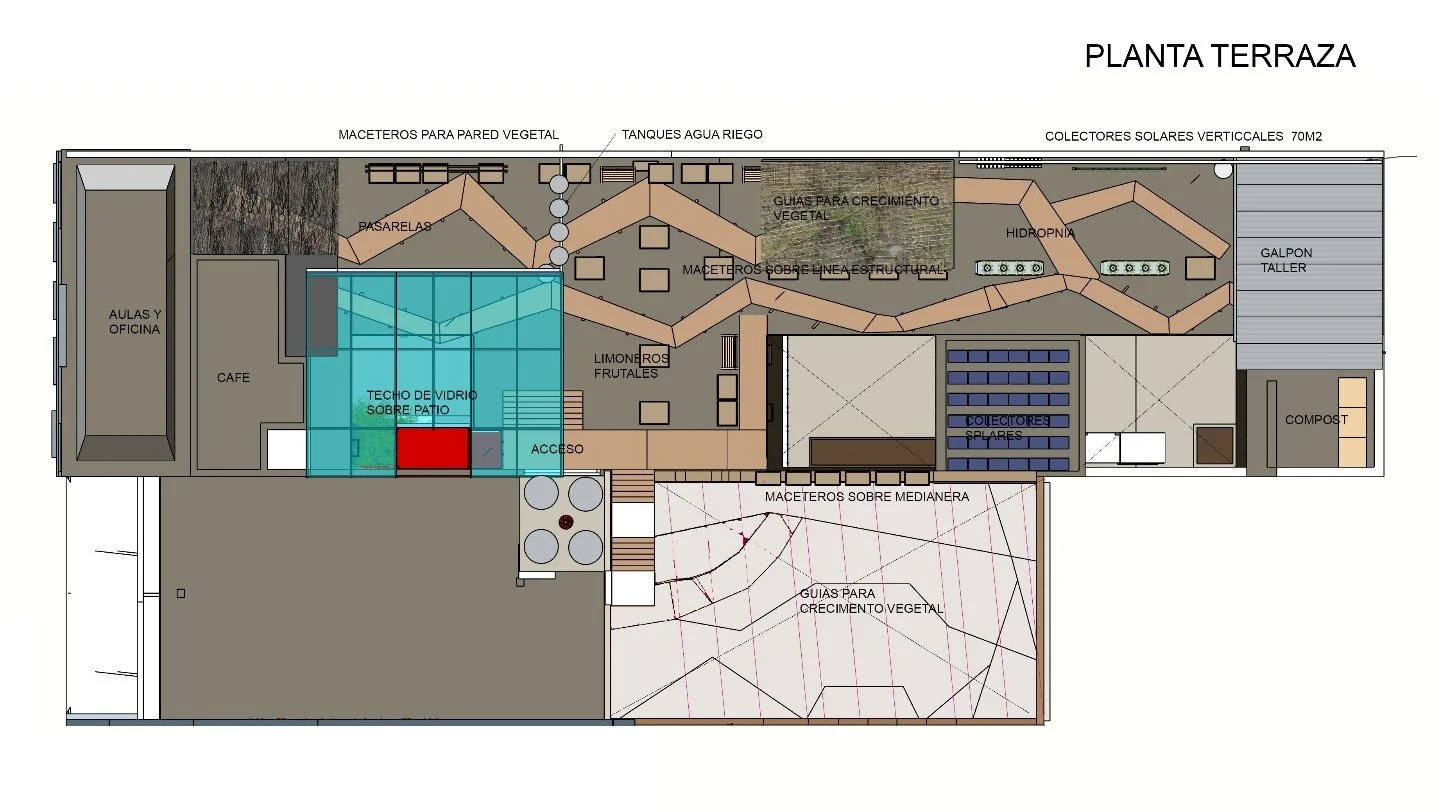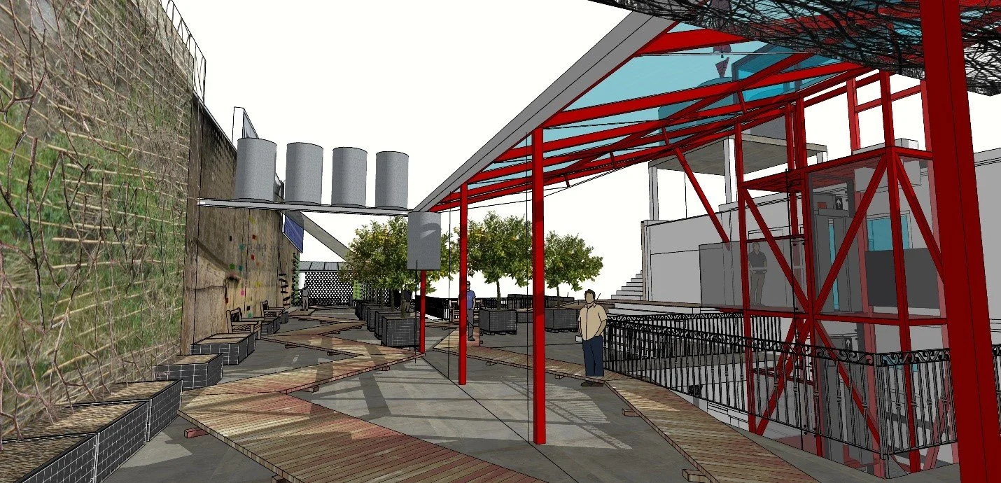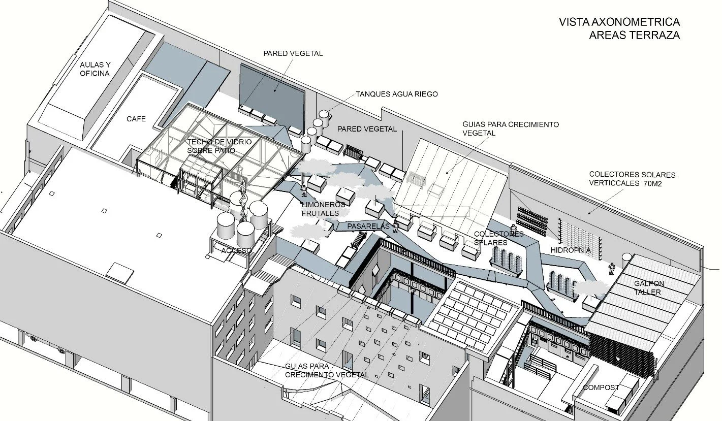También mejorar los vínculos en cuanto a movilidad con un ascensor que abastece y recorre todos los pisos y nos conduce a un nuevo espacio: Las Terrazas, un espacio que hoy dia no tiene ningún uso y se puede transformar en un polo de gran atracción en temas de vital importancia en la actualidad como Conciencia Ambiental , Sustentabilidad, cambio climático, etc.